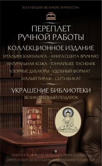 В каждом экземпляре — избранные цитаты и гравированный портрет автора, отпечатанные на дизайнерской бумаге, изготовленной на четверть из натуральной кожи. Переплеты созданы по традиционной для XIX века технологии из гладкой натуральной кожи и украшены тремя видами рельефного тиснения —золотым, рельефным и красочным. Форзацы книги из дизайнерской тонированной бумаги и тисненные золотом орнаментальные дублюры. Каптал и ляссе из шелка и трехсторонний торшонированный обрез.