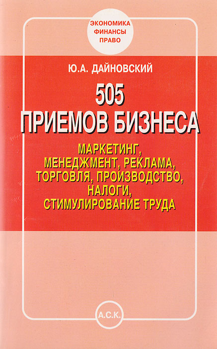 | Полное название книги | Ю. А. Дайновский 505 приемов бизнеса: маркетинг, менеджмент, реклама, торговля, производство, налоги, стимулирование труда |