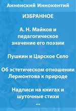 | Полное название книги | И. Ф. Анненский А. Н. Майков и педагогическое значение его поэзии. Пушкин и Царское Село. Об эстетическом отношении Лермонтова к природе. Сборник |
