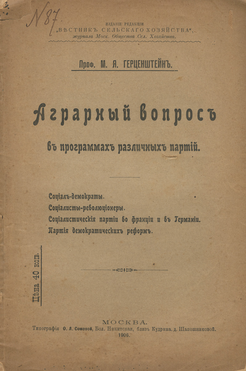 | Полное название книги | М. Я. Герценштейн Аграрный вопрос в программах различных партий |