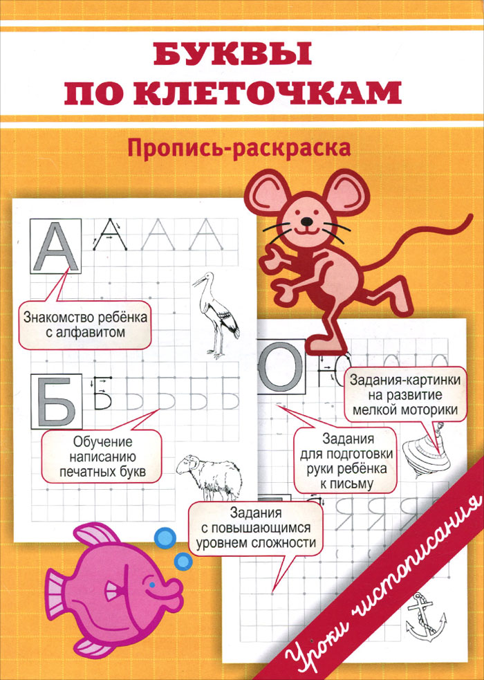 Практическое пособие предназначено для ознакомления ребёнка с написанием печатных букв. Пропись включает задания по написанию печатных букв, задания-картинки на развитие мелкой моторики и для подготовки руки ребёнка к письму. Задания в прописи идут от простого к сложному: обведение буквы; написание буквы по опорным точкам; самостоятельное написание букв. Навыки, приобретенные ребенком при выполнении заданий из прописи, пригодятся ему и в дальнейшем: при написании прописных букв, в рисовании, ручном труде. Рядом с каждой буквой расположена картинка, начинающаяся на эту букву. Желательно при написании каждой буквы проговаривать её, тогда ваш ребёнок обязательно выучит все буквы. Это поможет ему в запоминании букв, разовьет его способность различать звуки на слух, ускорит обучение чтению! Это и многое другое вы найдете в книге Буквы по клеточкам. Пропись-раскраска (М. О. Георгиева)