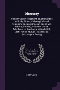 Книга "Directory. Franklin County Telephone co. (exchanges at Rocky Mount, Callaway), Mutual Telephone co. (exchanges at Boone Mill, Retreat, Ferrum), Southern Mutual Telephone co. (exchange at Glade Hill), East Franklin Mutual Telephone co. (exchange at Scrugg".This work has been selected by scholars as being culturally important, and is part of the knowledge base of civilization as we know it. This work was reproduced from the original artifact, and remains as true to the original work as possible. Therefore, you will see the original copyright references, library stamps (as most of these works have been housed in our most important libraries around the world), and other notations in the work.This work is in the public domain in the United States of America, and possibly other nations. Within the United States, you may freely copy and distribute this work, as no entity (individual or corporate) has a copyright on the body of the work.As a reproduction of a historical artifact, this work may contain missing or blurred pages, poor pictures, errant marks, etc. Scholars believe, and we concur, that this work is important enough to be preserved, reproduced, and made generally available to the public. We appreciate your support of the preservation process, and thank you for being an important part of keeping this knowledge alive and relevant. Это и многое другое вы найдете в книге Directory. Franklin County Telephone co. (exchanges at Rocky Mount, Callaway), Mutual Telephone co. (exchanges at Boone Mill, Retreat, Ferrum), Southern Mutual Telephone co. (exchange at Glad (M. l'abbé Trochon)