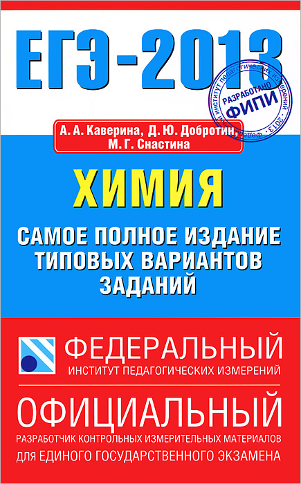 | Полное название книги | М. Г. Снастина, А. А. Каверина, Д. Ю. Добротин ЕГЭ 2013. Химия. Самое полное издание типовых вариантов заданий |