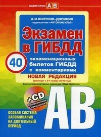 | Полное название книги | А. И. Копусов-Долинин Экзамен в ГИБДД. Категории "А" и "В". 40 экзаменационных билетов (+ CD) |