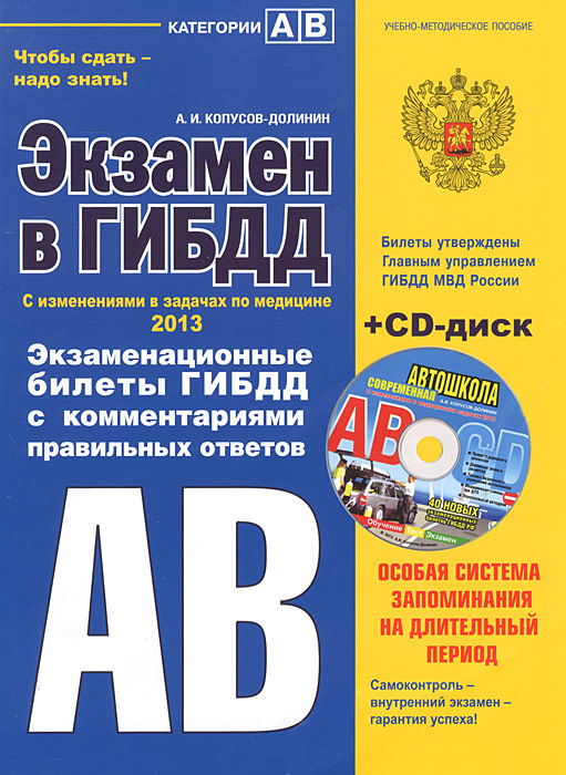 | Полное название книги | А. И. Копусов-Долинин Экзамен в ГИБДД. Категории А, В. Экзаменационные билеты ГИБДД с комментариями правильных ответов (+ CD-ROM) |