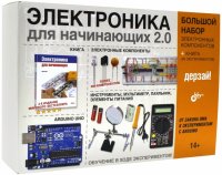 Хотите изучить фундаментальные основы электроники и электротехники и создавать интересные проекты своими собственными руками?Откройте эту коробку и начните заниматься монтажом реальных действующих проектов с первых страниц прилагаемой книги. В процессе выполнения увлекательных экспериментов вы изучите основные электронные компоненты, принципы работы электронных устройств и теоретические вопросы.В НАБОРЕ:- РЕЗИСТОРЫ1х Резистор NTC-MF52-103/3950 10K10х Резистор 47 Ом10х Резистор 100 Ом10х Резистор 150 Ом10х Резистор 220 Ом10х Резистор 330 Ом10х Резистор 470 Ом10х Резистор 680 Ом10х Резистор 1 кОм10х Резистор 2,2 кОм10х Резистор 4,7 кОм10х Резистор 6,8 кОм12х Резистор 10 кОм10х Резистор 47 кОм10х Резистор 100 кОм10х Резистор 220 кОм10х Резистор 330 кОм10х Резистор 470 кОм10х Резистор 1 Мом- ПОТЕНЦИОМЕТРЫ1х Подстроенный потенциометр 10 кОм1х Подстроенный потенциометр 20 кОм1х Подстроенный потенциометр 100 кОм1х Подстроенный потенциометр 500 кОм1х Подстроенный потенциометр 1М2х Потенциометр на 1 кОм- КОНДЕНСАТОРЫ8х Конденсатор керамический 0,01 мкФ1х Конденсатор керамический 0,022 мкФ1х Конденсатор керамический 0,047 мкФ 2х Конденсатор керамический 0,1 мкФ2х Конденсатор керамический 0,33 мкФ3х Конденсатор керамический 1 мкФ2х Конденсатор керамический 3,3 мкФ5х Конденсатор керамический 10 мкФ1х Конденсатор электролитический 2,2 мкФ1х Конденсатор электролитический 15 мкФ1х Конденсатор электролитический 22 мкФ1х Конденсатор электролитический 33 мкФ2х Конденсатор электролитический 68 мкФ2х Конденсатор электролитический 100 мкФ1х Конденсатор электролитический 220 мкФ2х Конденсатор электролитический 1000 мкФ- КНОПКИ, ТУМБЛЕРЫ, РЕЛЕ2х Двухполюсное реле на два направления, на 9 В пост, тока10х Кнопка тактовая 6x6x5 мм4х Однополюсный ползунковый переключатель на два направления2х Тумблер на два направления ASW-13-102 on-on- СВЕТОДИОДЫ2х Светодиод красный 5 мм2х Светодиод зеленый 5 мм2х Светодиод желтый 5 мм2х Светодиод синий 5 мм15х Слаботочный светодиод3х Одноразрядный числовой светодиодный дисплей высотой 14,2 мм- ТРАНЗИСТОРЫ, ТИРИСТОРЫ1х Германиевый диод 1N40011х Диод 1 N40013х Диод 1 N41481х Стабилизатор напряжения LM78056х Транзистор серии 2N2222- ИНТЕГРАЛЬНЫЕ МИКРОСХЕМЫ1х Интегральная схема аудиоусилителя LM3861х Логическая микросхема 74НС001х Логическая микросхема 74НС021х Логическая микросхема 74НС081х Логическая микросхема 74НС271х Логическая микросхема 74НС321х Логическая микросхема 74НС3934х Микросхема таймера 5553х Микросхема серии 4026В- ПЛАТЫ С КОНТРОЛЛЕРОМ1х Arduino Uno + кабель- ДИНАМИК2х Динамик с импедансом 8 Ом, 40 мм 1х Динамик с импедансом 8 Ом, 77 мм 1х Наушники с высоким импедансом- ЭЛЕМЕНТЫ ПИТАНИЯ, ЗАРЯДНОЕ УСТРОЙСТВО1х Батарея 9 В2х Батарея на 1,5 В1х Блок питания 9 В1х Отсек для батареи1х Клипса для батареи "Крона"2х Плавкий предохранитель на 1 А- МАКЕТНАЯ ПЛАТА, ПРОВОДА, ЗАЖИМЫ-КРОКОДИЛЫ1х Зажим "крокодил" малый (красный) 2,8 см1х Зажим "крокодил" малый (черный) 2,8 см3х Зажим "крокодил" средний (черный) 4,5 см1х МВ-102. Плата макетная беспаечная, 830 контактов, 16,5x5,5 см10х Провода с разъемами "папа-папа"1х Набор перемычек для макетных плат (140 шт.)1х Перфорированная плата с нанесенными дорожками из меди1х Плоская перфорированная плата без медного покрытия3х Провода с "крокодилами" на обоих концах- ИЗМЕРИТЕЛЬНЫЙ ПРИБОР1х Мультиметр- ИНСТРУМЕНТЫ1х Отвертка1х Держатель "третья рука"1х Нож1х Паяльник1х Тонкий припой1х Удлиненные плоскогубцы- РАЗНОЕ1х Магнит