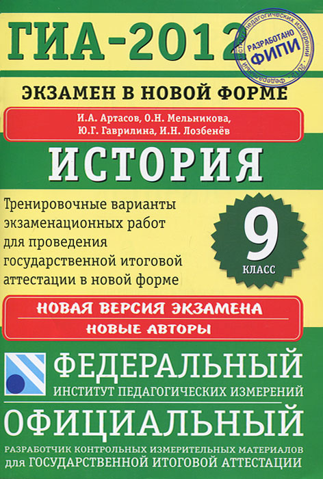 | Полное название книги | И. А. Артасов, Ю. Г. Гаврилина, И. Н. Лозбенев, О. Н. Мельникова ГИА-2012. Экзамен в новой форме. История. 9 класс. Тренировочные варианты экзаменационных работ для проведения государственной (итоговой) аттестации в новой форме |