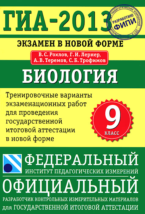 | Полное название книги | А. В. Теремов, С. Б. Трофимов, В. С. Рохлов, Г. И. Лернер ГИА-2013. Экзамен в новой форме. Биология. 9 класс. Тренировочные варианты экзаменационных работ |