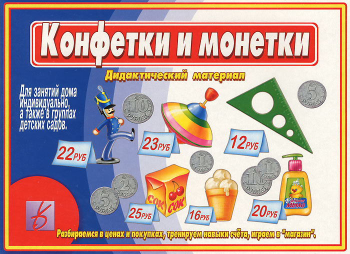 Перед началом игры разрежьте карты по пунктирным линиям, у вас получится 48 карточек с картинками и 96 карточек с монетами. Это и многое другое вы найдете в книге Игра "Конфетки и монетки". Д-469 (а)