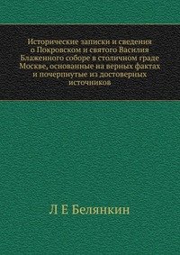 | Полное название книги | Л Е Белянкин Исторические записки и сведения о Покровском и святого Василия Блаженного соборе в столичном граде Москве, основанные на верных фактах и почерпнутые из достоверных источников |