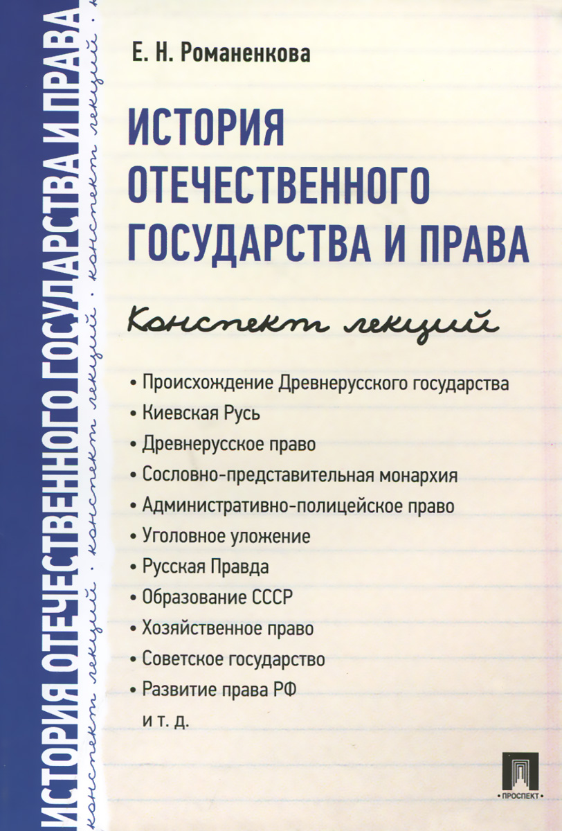 | Полное название книги | Е. Н. Романенкова История отечественного государства и права. Конспект лекций.Уч.пос.-М.:Проспект,2015 |