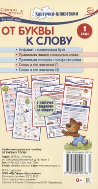 | Полное название книги | Цветкова Татьяна Владиславовна, Цветкова Татьяна Константиновна Карточки-шпаргалки. От буквы к слову. 1 класс. 5 карточек с заданием на обороте |