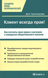 | Полное название книги | Д. Е. Гусятникова Клиент всегда прав! Как потребителю отстоять свои интересы в магазине и на предприятии общественного питания |