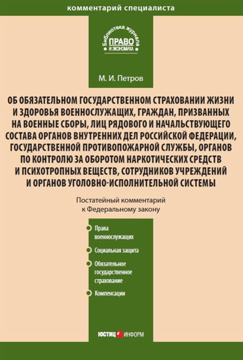 | Полное название книги | М. И. Петров Комментарий к Федеральному закону "Об обязательном государственном страховании жизни и здоровья военнослужащих, граждан, призванных на военные сборы, лиц рядового и начальствующего соста |