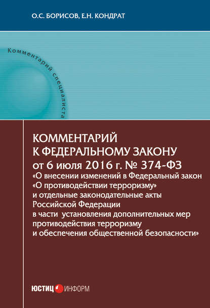 | Полное название книги | Елена Николаевна Кондрат, Олег Станиславович Борисов Комментарий к Федеральному закону от 6 июля 2016 г. № 374-ФЗ «О внесении изменений в Федеральный закон „О противодействии терроризму“ и отдельные законодательные акты Российской Федерации в части установления дополнительных мер противодействия терроризму и обеспечения общественной безопасности» |