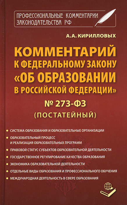 | Полное название книги | А. А. Кирилловых Комментарий к ФЗ"Об образовании в РФ" № 273-ФЗ. (постатейный). Кирилловых А.А |