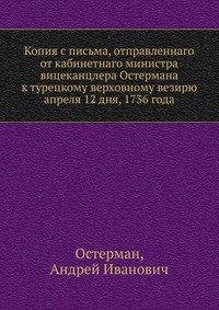 | Полное название книги | Остерман, Андрей Иванович Копия с письма, отправленнаго от кабинетнаго министра вицеканцлера Остермана к турецкому верховному везирю апреля 12 дня, 1736 года |