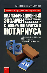 | Полное название книги | А. О. Белякова, Г. Г. Черемных Квалификационный экзамен для лиц, претендующих на должности стажера нотариуса и нотариуса. Экзаменационные ответы |