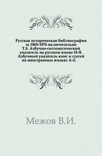 | Полное название книги | В. И. Межов Литература русской истории за 1859-1864 гг. включительно. Т.1. 1866. Т.8. Азбучно-систематический указатель на русском языке Н-Я. Азбучный указатель книг и статей на иностранных языках A-Z |
