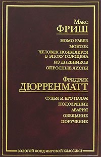 | Полное название книги | Макс Фриш, Фридрих Дюрренматт Макс Фриш. Homo Faber. Монток. Человек появляется в эпоху голоцена. Из дневников. Опросные листы. Фридрих Дюрренматт. Судья и его палач. Подозрение. Авария. Обещание. Поручение |