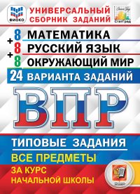 Книга содержит 24 варианта типовых заданий Всероссийской проверочной работы (ВПР) за курс начальной школы по трём предметам (по 8 вариантов).