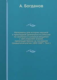 | Полное название книги | А. Богданов Материалы для истории научной и прикладной деятельности в России по зоологии и соприкасающимся с ней отраслям знания, преимущественно за последнее тридцатипятилетие 1850-1887 г. Том 1 |