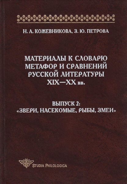 | Полное название книги | Зоя Юрьевна Петрова, Наталья Алексеевна Кожевникова Материалы к словарю метафор и сравнений русской литературы XIX-XX вв. Выпуск 2. Звери, насекомые, рыбы, змеи |