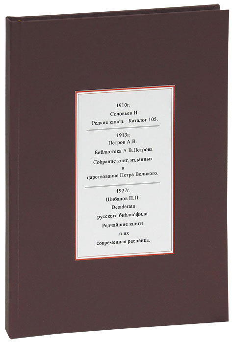 | Полное название книги | А. В. Петров, Н. Соловьев, П. П. Шибанов Н. Соловьев. Редкие книги. Каталог 105. А. В. Петров. Библиотека А. В. Петрова. Собрание книг, изданных в царствование Петра Великого. П. П. Шибанов. Desiderata русского библиофила. Редчайшие |