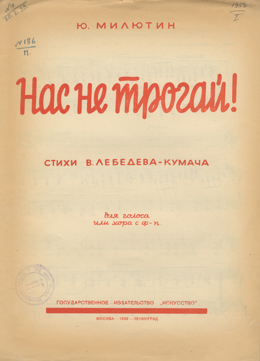 | Полное название книги | В. Лебедев-Кумач, Ю. Милютин Нас не трогай! Для голоса или хора с ф-п |