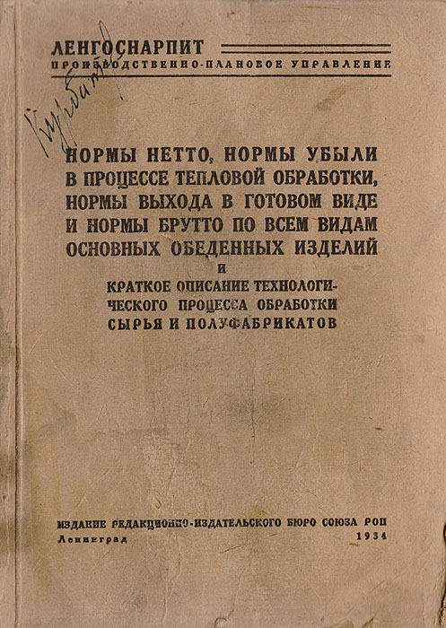 | Полное название книги | Нормы нетто, нормы убыли в процессе тепловой обработки, нормы выхода в готовом виде и нормы брутто по всем видам основных обеденных изделий и краткое описание технологического процесса обрабо |