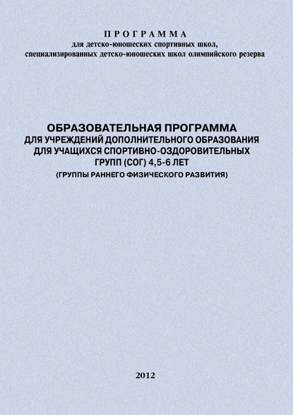 | Полное название книги | Евгений Головихин, Дина Владимировна Головихина Образовательная программа для УДО для учащихся спортивно-оздоровительных групп (СОГ) 4,5-6 лет (группы раннего физического развития) |