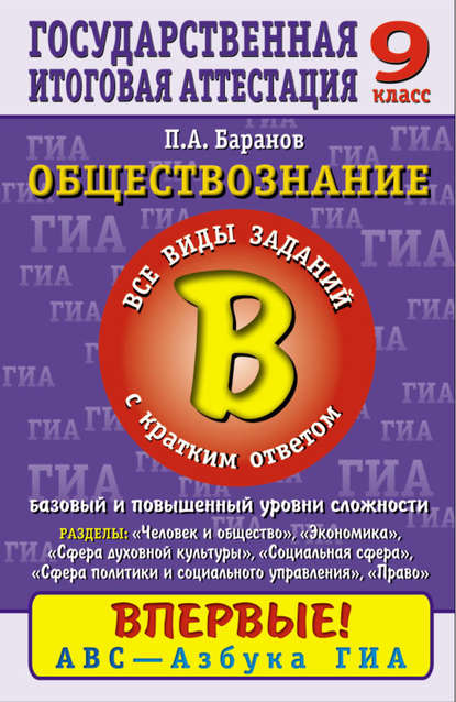 | Полное название книги | Петр Анатольевич Баранов Обществознание. Часть 2 (В). Все виды заданий с кратким ответом. Базовый и повышенный уровни сложности. Содержательные блоки «Человек и общество», «Сфера духовной культуры», «Экономика», «Социальная сфера», «Сфера политики и социального управления», «Право». 9 класс |