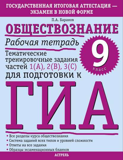 | Полное название книги | Петр Анатольевич Баранов Обществознание. Рабочая тетрадь. Тематические тренировочные задания частей 1 (А), 2 (В), 3 (С) для подготовки к ГИА. 9 класс |