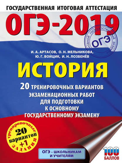 | Полное название книги | Игорь Анатольевич Артасов, Игорь Николаевич Лозбенев, Юлия Григорьевна Войцик, Ольга Николаевна Мельникова ОГЭ-2019. История. 20 тренировочных вариантов экзаменационных работ для подготовки к основному государственному экзамену |