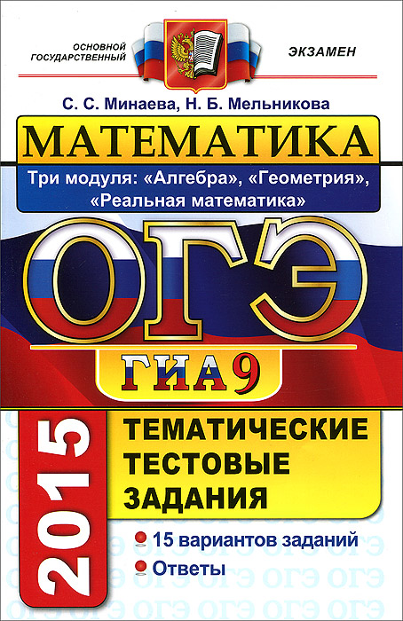 | Полное название книги | Н. Б. Мельникова, С. С. Минаева ОГЭ (ГИА-9) 2015. Математика. 9 класс. Основной государственный экзамен. Типовые тестовые задания. Три модуля. Алгебра, геометрия, реальная математика |