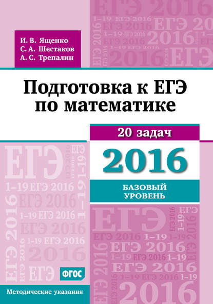 | Полное название книги | Иван Валериевич Ященко, Андрей Сергеевич Трепалин, Сергей Алексеевич Шестаков Подготовка к ЕГЭ по математике в 2016 году. Базовый уровень. Методические указания |
