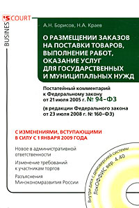| Полное название книги | Н. А. Краев, А. Н. Борисов Постатейный комментарий к Федеральному закону "О размещении заказов на поставки товаров, выполнение работ, оказание услуг для государственных и муниципальных нужд" (+ CD-ROM) |