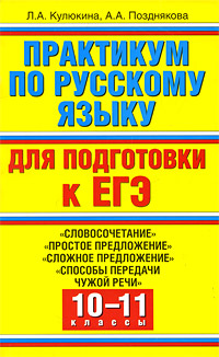 | Полное название книги | А. А. Позднякова, Л. А. Кулюкина Практикум по русскому языку для подготовки к ЕГЭ. "Словосочетание", "Простое предложение", "Сложное предложение", "Способы передачи чужой речи". 10-11 |