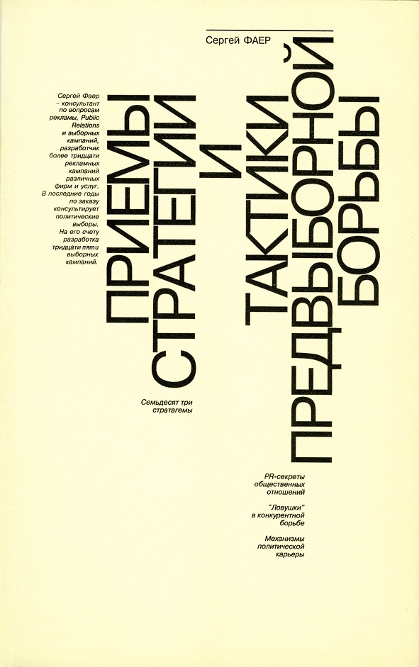 | Полное название книги | С. А. Фаер Приемы стратегии и тактики предвыборной борьбы: PR-секреты общественных отношений; "Ловушки" в конкурентной борьбе; Механизмы политической карьеры |