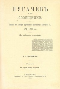 | Полное название книги | Дубровин Николай Федорович Пугачев и его сообщники. Эпизод из истории царствования Императрицы Екатерины II. В 3-х кн. В 3-х томах. Полный комплект. Редкость |