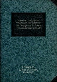 | Полное название книги | А. П. Федченко Путешествие в Туркестан члена-основателя общества А.П. Федченко, совершенное от императорского Общества любителе естествознания по поручению Туркестанского генерал-губернатора К.П. Фон-Кауфма |