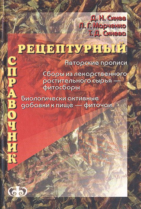 | Полное название книги | Д. Н. Синев, Л. Г. Марченко, Т. Д. Синева Рецептурный справочник: (Авторские прописи. Сборы из лекарственного растительного сырья - фитосборы. Биологически активные добавки к пище - фиточаи) |