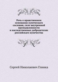 | Полное название книги | С. Н. Глинка Речь о нравственном основании купеческаго сословия, силе внутренной промышленности и наследственных добродетелях российскаго купечества |