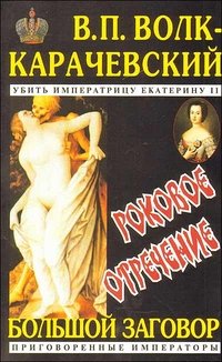 Роман-хроника "Большой заговор. Приговоренные императоры. Убить императрину Екатерину II" описывает исторические события с момента царствования Екатерины II, создания первого масонского государства в Северной Америке и великой масонской революции во Франции до наших дней. В центре повествования — судьбы правителей России и тех государственных деятелей Европы, которые оказались на пути масонов к мировому господству. Все правители России от Екатерины II до Николая II пали жертвами тайных сил, шаг за шагом продвигавшихся к своей цели. Русские императоры были приговорены к смерти, как некогда французские "проклятые короли", поплатившиеся жизнью за разгром ордена тамплиеров, возродившегося во всемирном сообществе франк-масонов. Первые книги посвящены истории убийства императрицы Екатерины II и ее фаворита, светлейшего князя Потемкина, а также королю Франции Людовику XVI и королеве Марии Антуанетте, сложившим головы на эшафоте, и выходу на историческую арену Наполеона Бонапарта, положившего на полях сражений миллионы голов. Это и многое другое вы найдете в книге Роковое отречение (В. П. Волк-Карачевский)