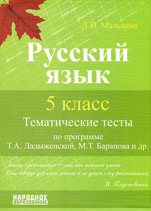 | Полное название книги | Л. А. Мальцева Русский язык 5 кл. Тематические тесты по программе Т.А.Ладыженской, М.Т.Баранова |
