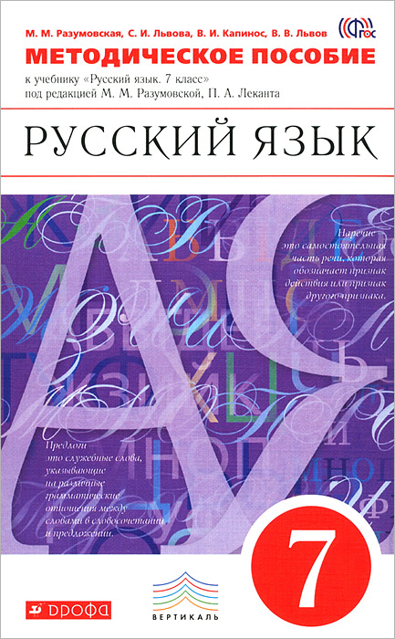 | Полное название книги | С. И. Львова, В. И. Капинос, М. М. Разумовская, В. В. Львов Русский язык. 7 класс. Методическое пособие к учебнику под редакцией М. М. Разумовской, П. А. Леканта |