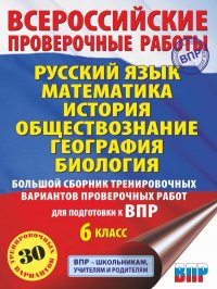 | Полное название книги | Мельникова Ольга Николаевна, Артасов Игорь Анатольевич, Соловьева Юлия Алексеевна, Ирина Викторовна Русский язык. Математика. История. Обществознание. География. Биология. Большой сборник тренировочных вариантов проверочных работ для подготовки к ВПР. 6 класс |