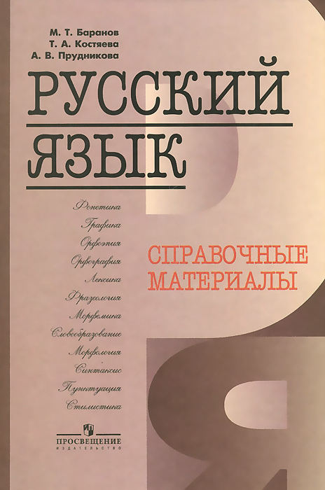| Полное название книги | М. Т. Баранов, Т. А. Костяева, А. В. Прудникова Русский язык. Справочные материалы |