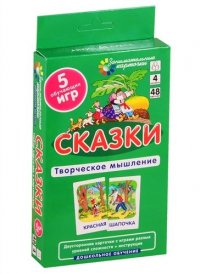 Занимательные карточки разработаны как средство, позволяющее реализовать безопасное для здоровья ребёнка развитие воображения и творческого мышления. С их помощью ребёнок сможет вспомнить любимые детские сказки, научится кратко пересказывать сюжет, выделять главных героев и даже самостоятельно сочинять истории. Представленный на карточках материал ориентирован на визуальное восприятие ребёнком знакомых образов персонажей и сцен из сказок и призван развивать воображение, фантазию ребёнка и связную речь. В наборе 48 двусторонних карточек и подробная инструкция с описанием 5 различных игр. Это и многое другое вы найдете в книге Сказки. Развиваем творческое мышление и речь (Е. Н. Куликова)