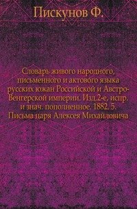 | Полное название книги | Коллектив авторов Словарь живого народного, письменного и актового языка русских южан Российской и Австро-Венгерской империи. Изд.2-е, испр. и знаЧасть пополненное. 1882. 5. Письма царя Алексея Михайловича |